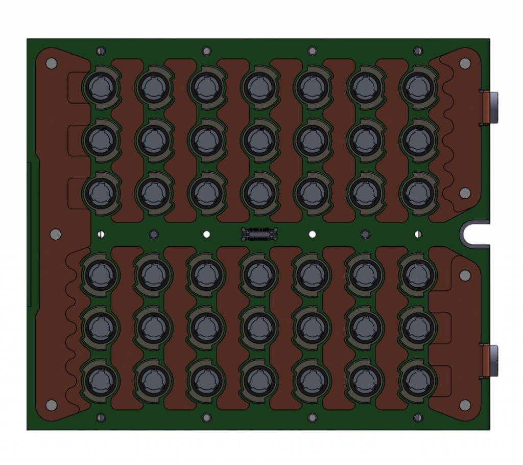 To restrain the cells at the top, I proposed a design which used the voltage sensing PCB itself as a structural plate. This board, which I designed in CAD in collaboration with the EECS team, sits directly on top of the cell array. It has precision-cut holes that fit around each cell and thick copper pads on its surface that the wirebonding machine bonds directly to, making the cell-to-cell electrical connections. Because it spans the full footprint of the module and is fastened to the structure on its short edges, it also acts as the plate that keeps the cells from moving upward under load. One part doing two jobs, drastically lowering our part count, and simplifying our manufacturing efforts substantially. This change removed multiple machining operations on the cell restraints that would have been necessary otherwise.
